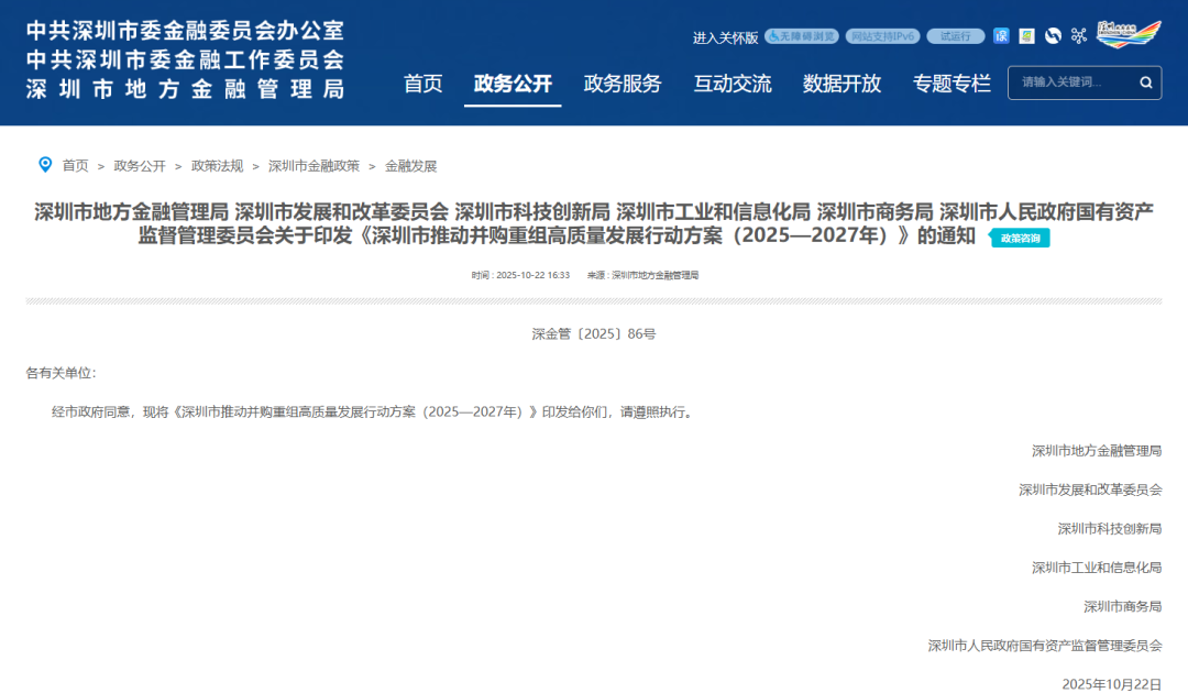 10月22日,深圳市地方金融管理局、深圳市发展和改革委员会、深圳市科技创新局、深圳市工业和信息化局、深圳市商务局、深圳市人民政府国有资产监督管理委员会联合印发《深圳市推动并购重组高质量发展行动方案(2025—2027年)》(简称《方案》)。